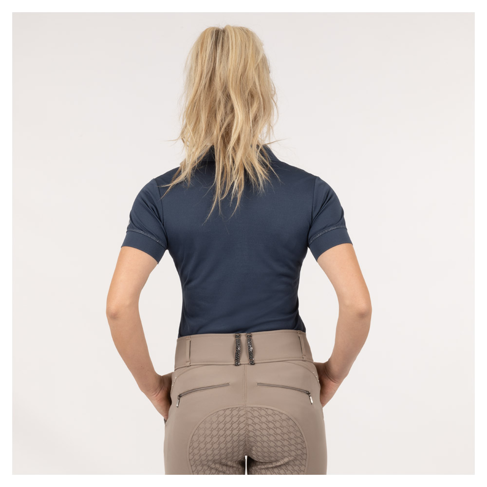 Lækker polo T-shirt med “diamantknapper” foroven samt fine sølvdetaljer ved skuldrene.