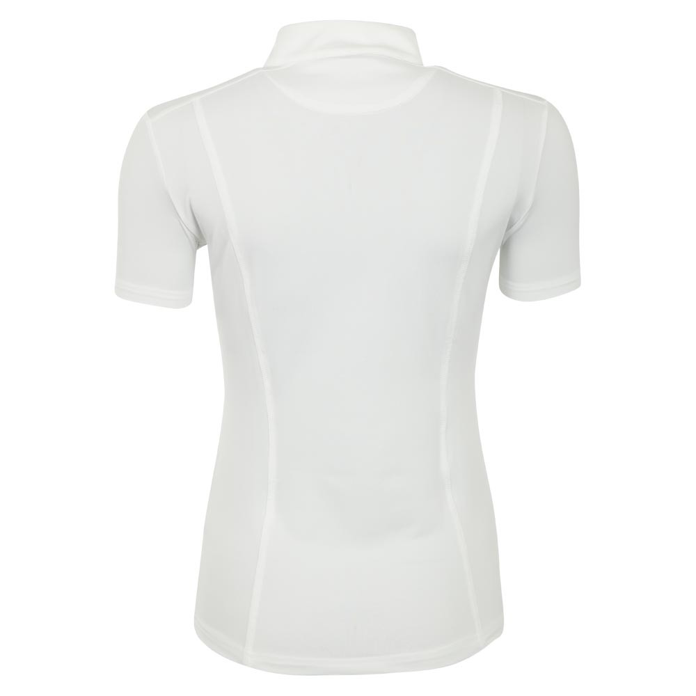 Smuk kortærmet stævne t-shirt med små sten og similisten på brystet giver den et eksklusivt look.Materialet er hurtigttørrende som gør blusen perfekt både til de kolde og varme dage.Blusen er komfortabel og strækbar og den høje hals har små “stropper” til at sætte slipset fast i. Skjult lynlås i halsen. Blusen er normal i størrelsen.