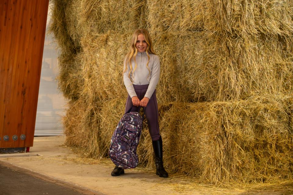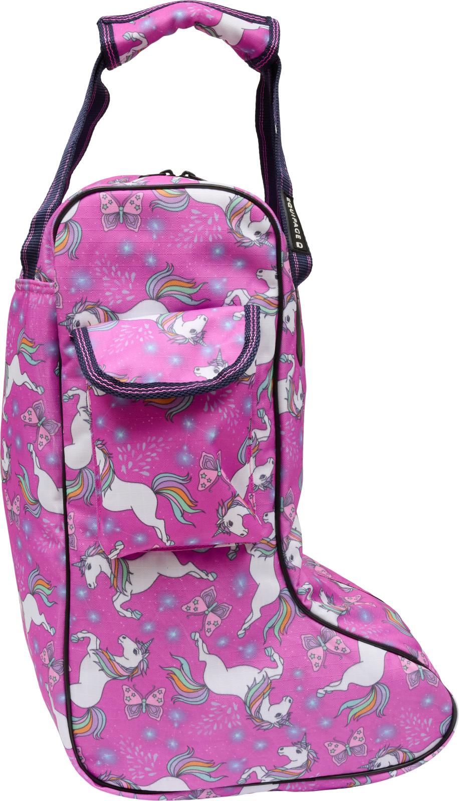 Børnestøvletaske foret med blødt fyld for ekstra beskyttelse. Stærk og veldesignet model, der kan modstå daglig brug og slitage. En udvendig velcrolomme til opbevaring af handsker, sporer osv. Polstrede håndtag med stigbøjlelogo i gummi. Slidstærkt og vandtæt materiale med flerfarvet enhjørningedesign.