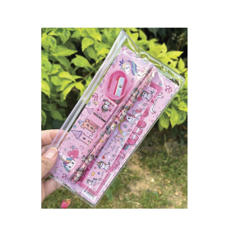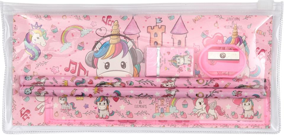 Fint lille penalhus med to blyanter, viskelæder, blyantspidser og lineal.