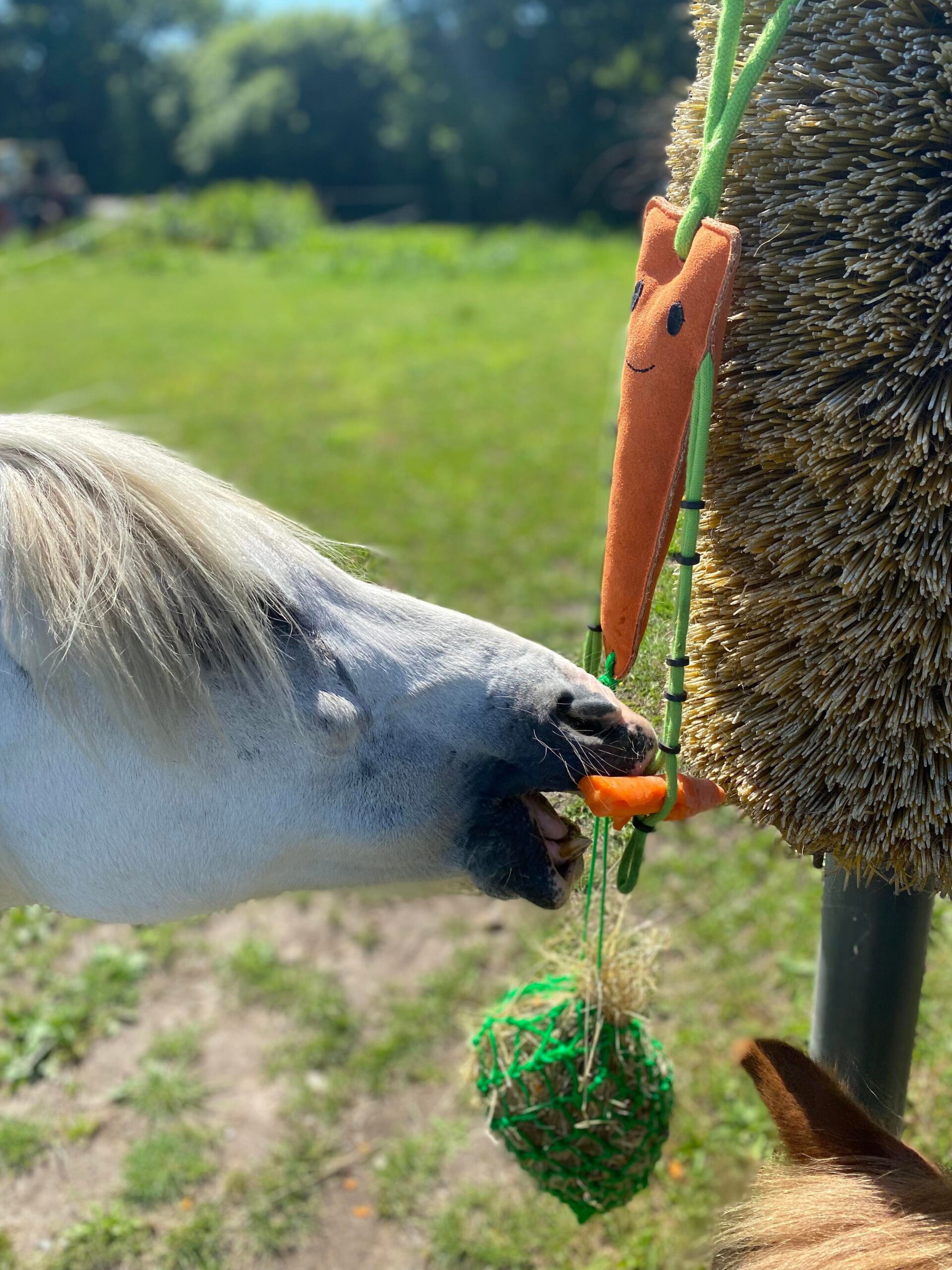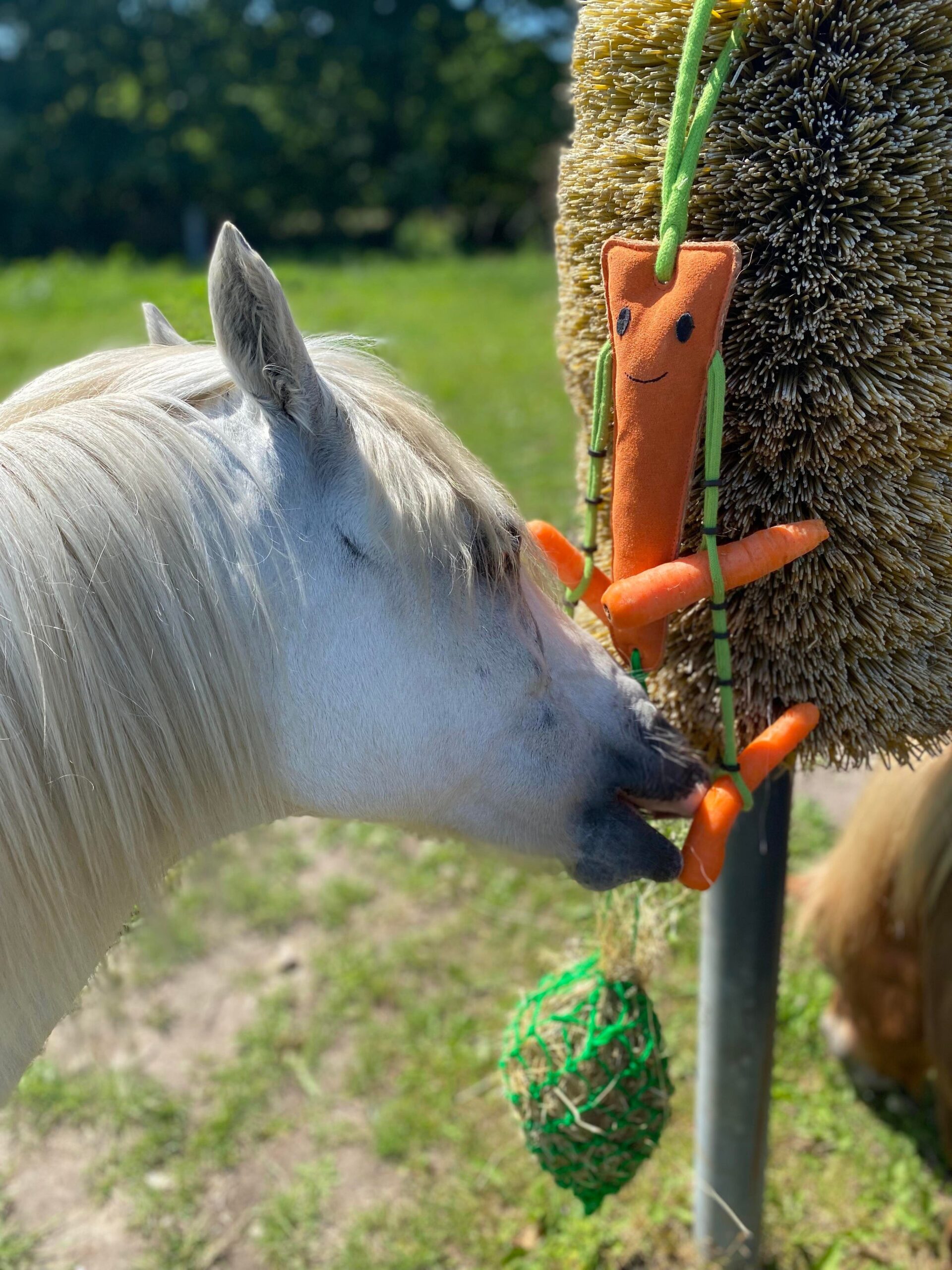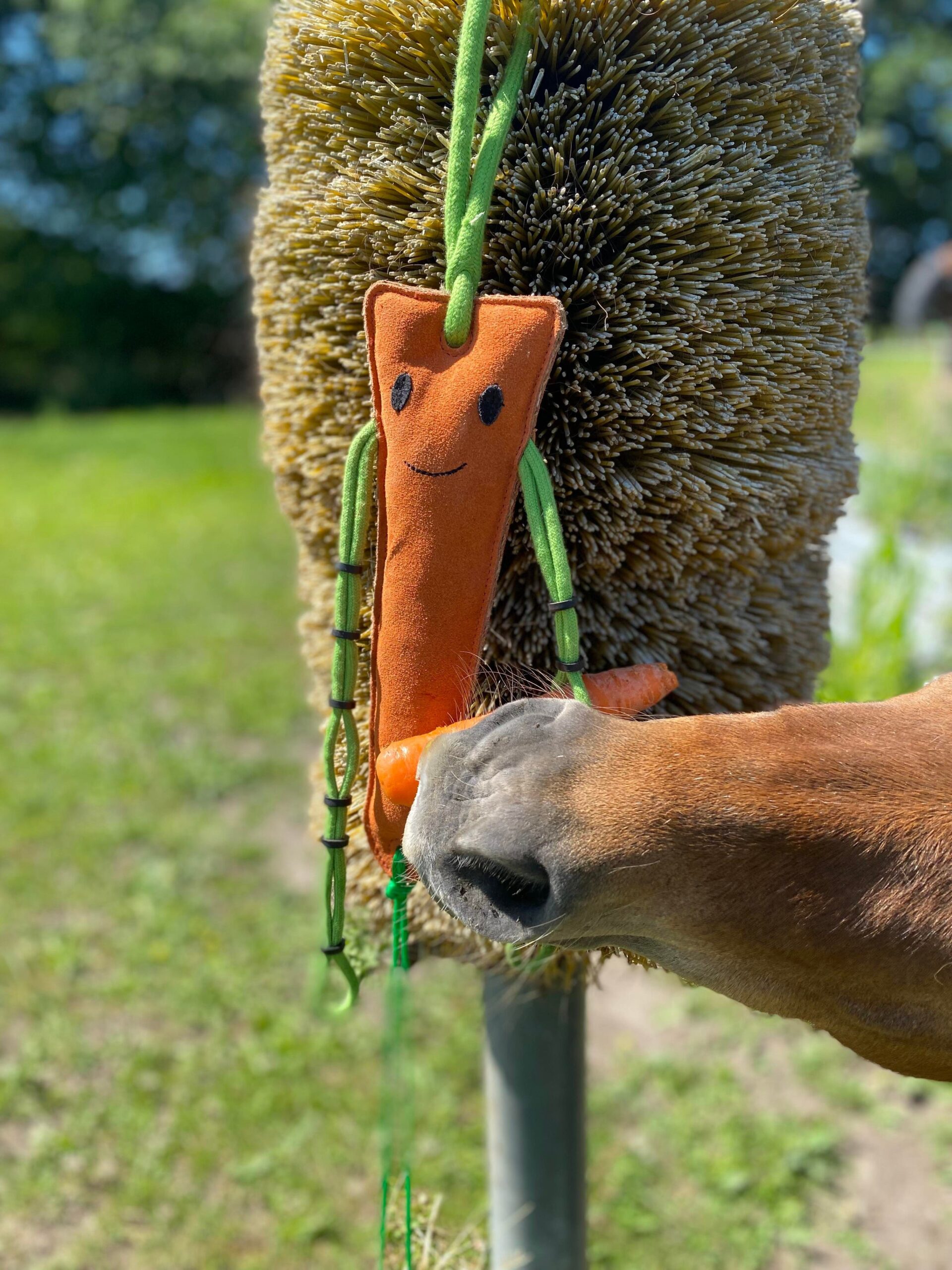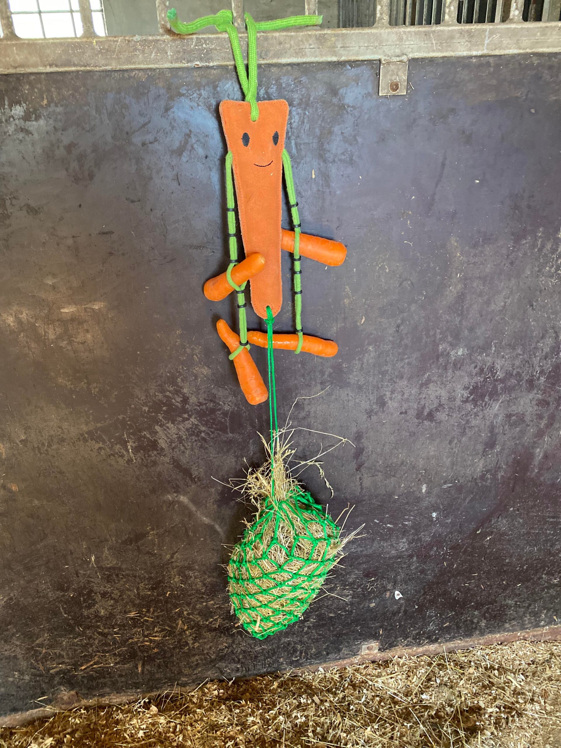 Legetøj til hesten, som stimulering i boksen. På gulerodens arme er der kraftige elastikker som justeres så der kan sidde gulerødder samt et lille hønet nedenunder. Guleroden er lavet af kraftig ruskind, så den kan tåle at hesten leger og bider i den. Guleroden måler ca. 31 cm. Hønettet er ca. 38 cm.