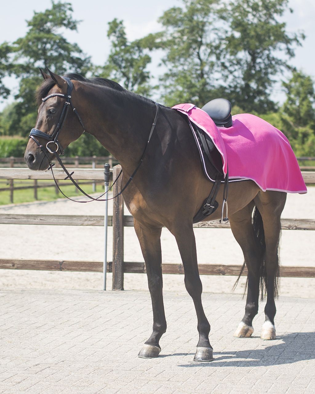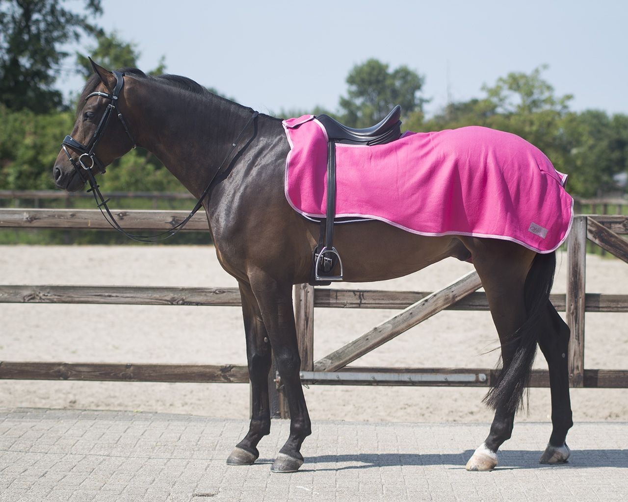 Klassisk fleece ridedækken der sikrer at din hest kan modstå kulden på bagpartiet mens du rider eller varmer op. Dette ridedækken er perfekt når hesten skal varmes op eller skridtes af for at forhindre at den nedkøles for hurtigt.Dækkenet har desuden velcro i front således at det kan åbnes når man eksempelvis sidder på hesten. Fås i pink, lyseblå og lilla Shet – 90 – 100 cmPony – 105-115 cmCob – 125 -130 cmFull – 135 – 145 cmX- Full 155-165 cm
