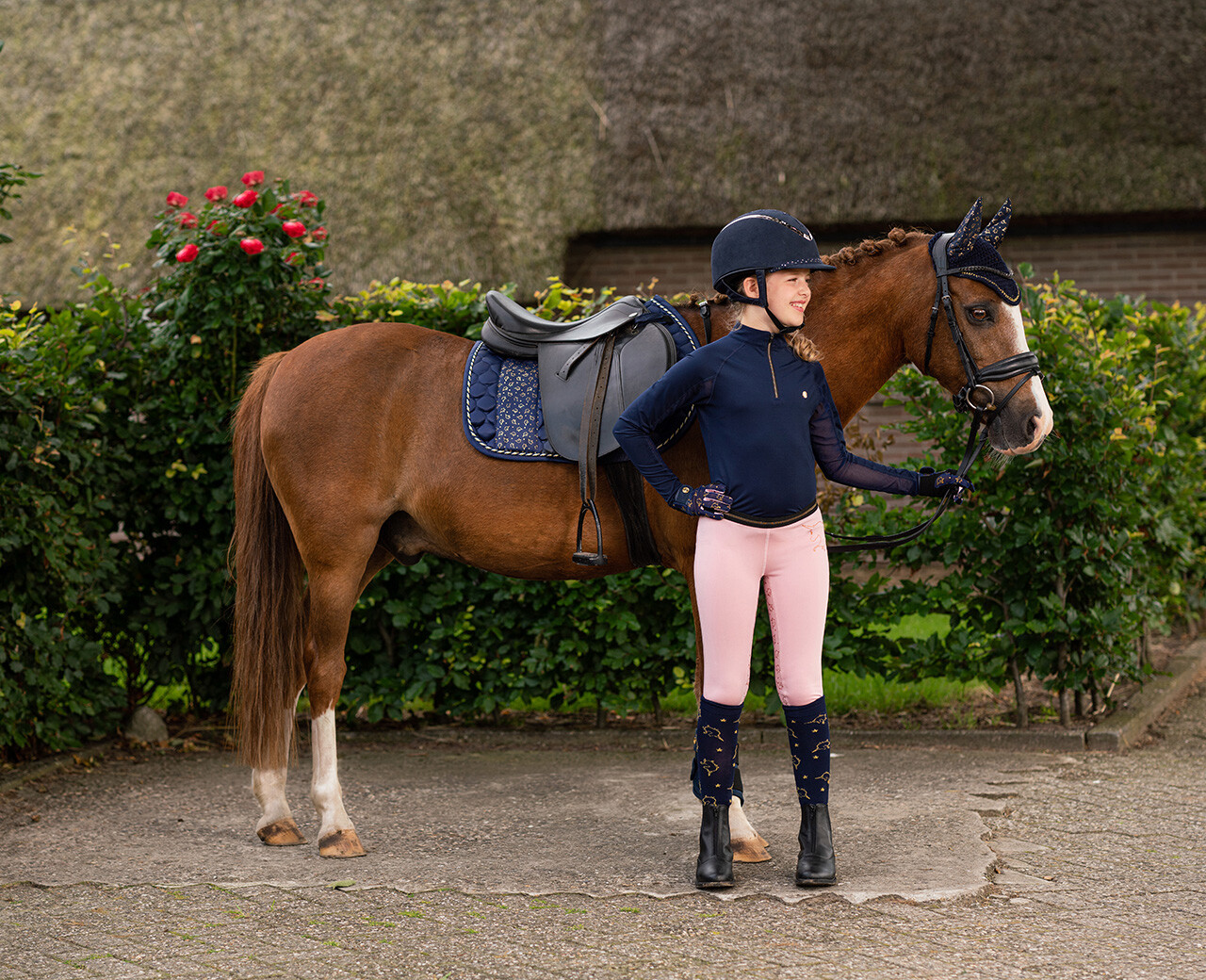 Lækre og bløde ridebukser i stretch materiale. Den brede elastik i livet – selvfølgelig med skinnende glimmer – gør disse bukser til en hver junior rytters must have. De er nemme at få af og på og sidder behageligt. Bukserne har fuld grip med enhjørningemotiv som går igen på grippen.